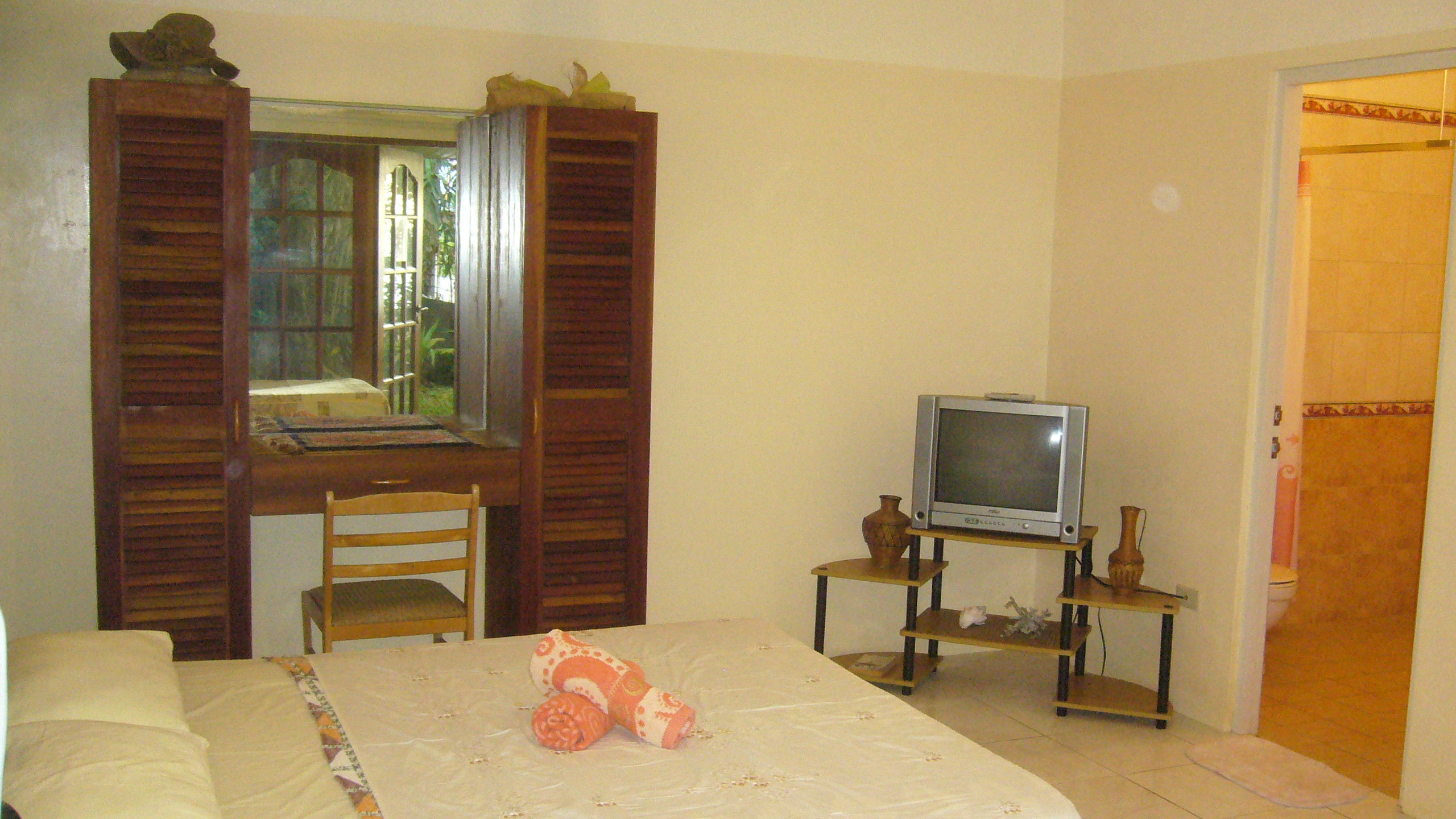 It is located on the slope above the Duplexbuilding in the main building just below the owners level. It is 6 meter wide and 5,50 meters deep to the folding doors, there is another 1,20 meters of tiled terrace under a roof overhang and another open 3 meters of lawn. The pool guest pool entrance is immediately to the left. The side windows are blurred glass so when the jalousie windows are closed no one can look into the Apartement. The glass folding door front can be covered by a curtain. Since the whole compound is surrounded by a barb-wired and alarmwired at least 2,40 meter high wall you can experience living and sleeping in the open. Year round temperature is around 28 degree Celsius. The folding doors are only needed if it´s rainy or too windy. But if you can´t be without aircondition: this apartment also offers that. | ||||||||||||||||||||||||||||||||||||||||||||||||||||||||||||||||||||||||||||||||||||||||||||||||||||||