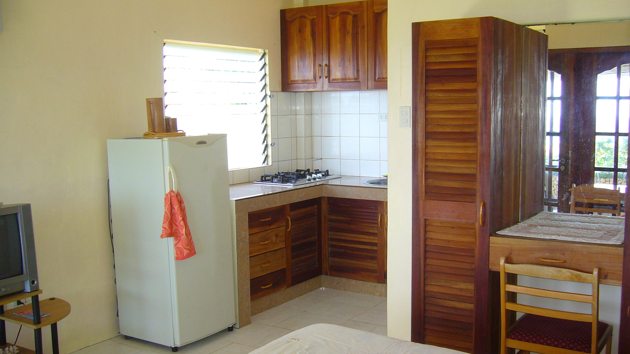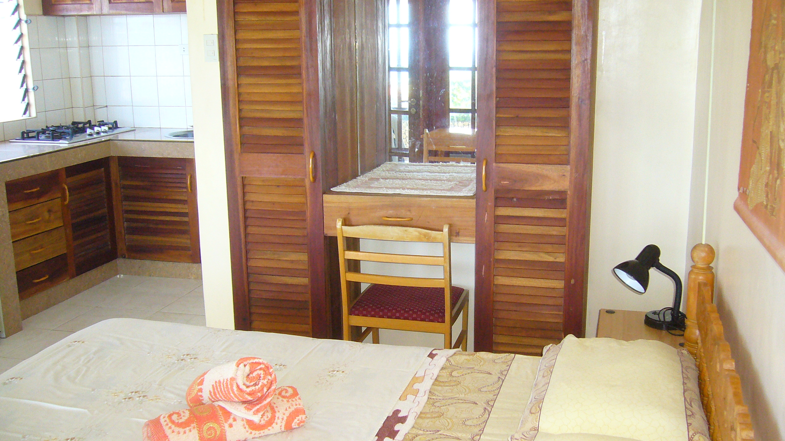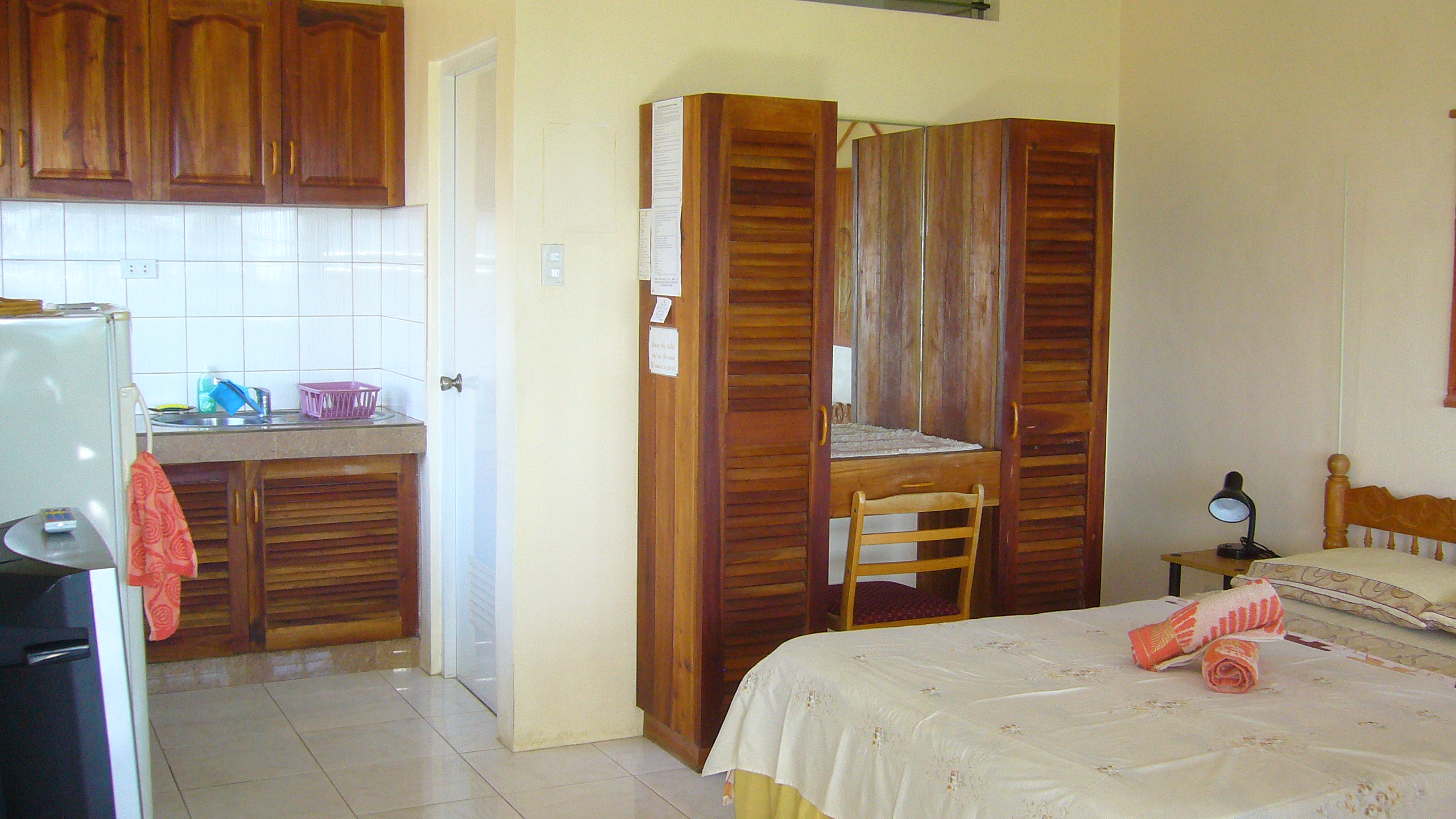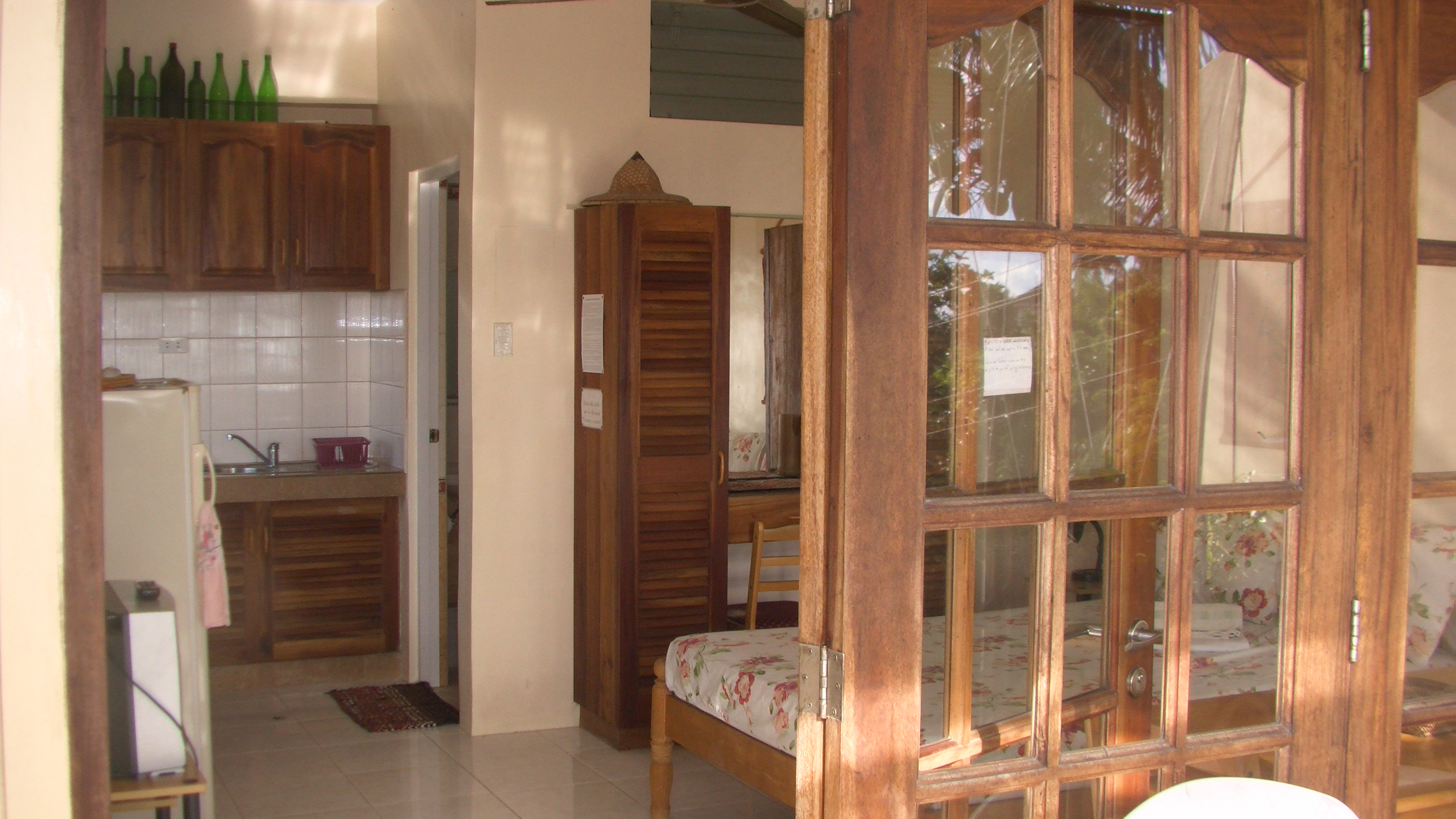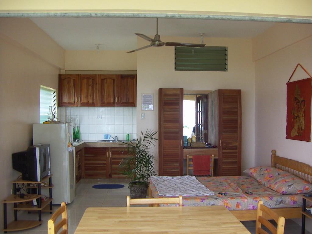 It is located a few meters down of the main building and consists like the name says of two similar apartments, both overlooking the ocean to the east with sunriseview, too. The apartements are 4 meters wide and 5,50 meters long plus the terrace of another 2 meters. The 4 folding doors can be closed during rainy or windy days but are designed to stay open so you can experience living in the open all day and night long safely since the whole compound is surrounded by a barb-wired and alarmwired at least 2,40 meter high wall. Year round temperature is around 28-32 degree Celsius. There is a wrought iron door in the gangway that can be operated only from inside the room restricting access so you don´t have to be afraid of persons unexpeted suddenly walking in. If you can´t be without aircondition: this apartment also offers that | ||||||||||||||||||||||||||||||||||||||||||||||||||||||||||||||||||||||||||||||||||||||||||||||||||||||