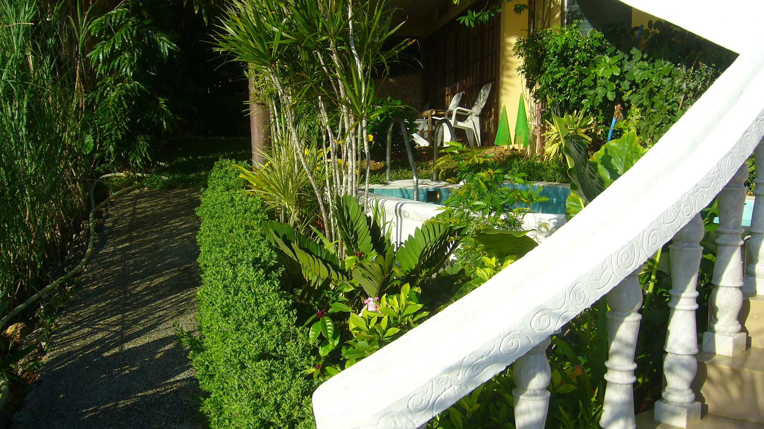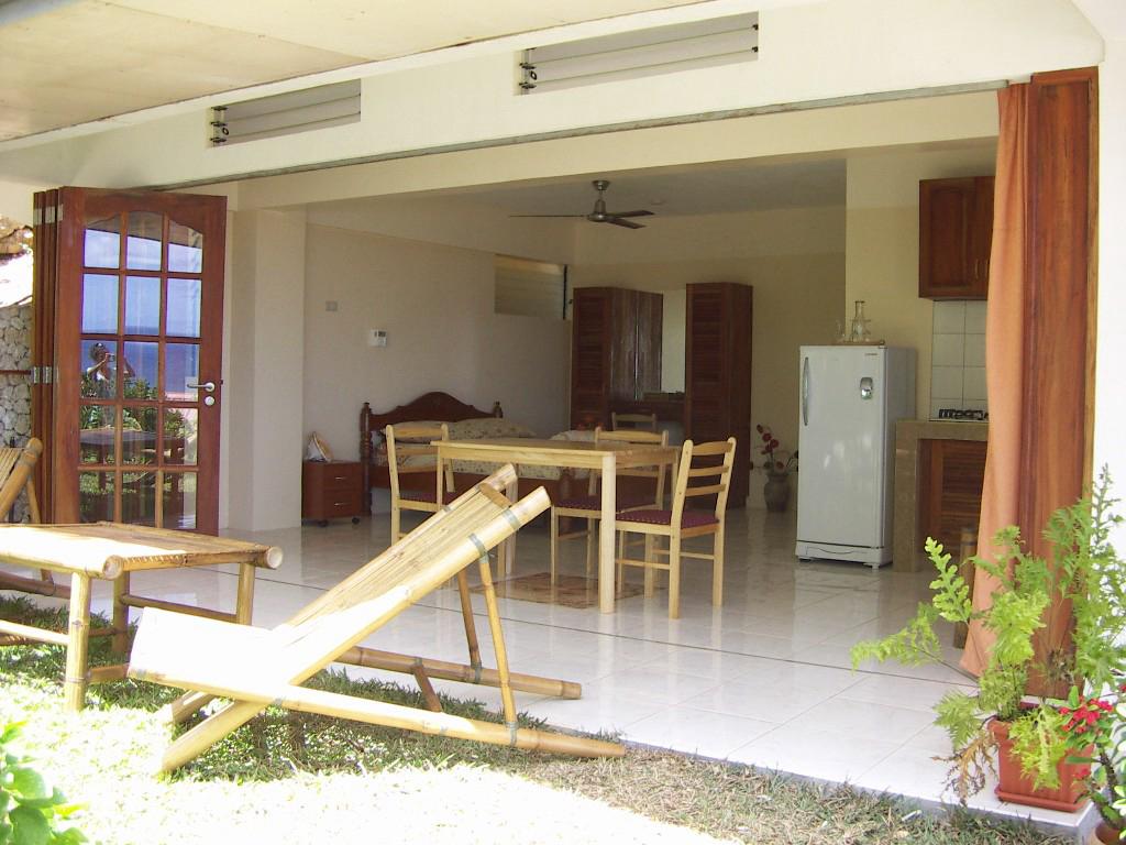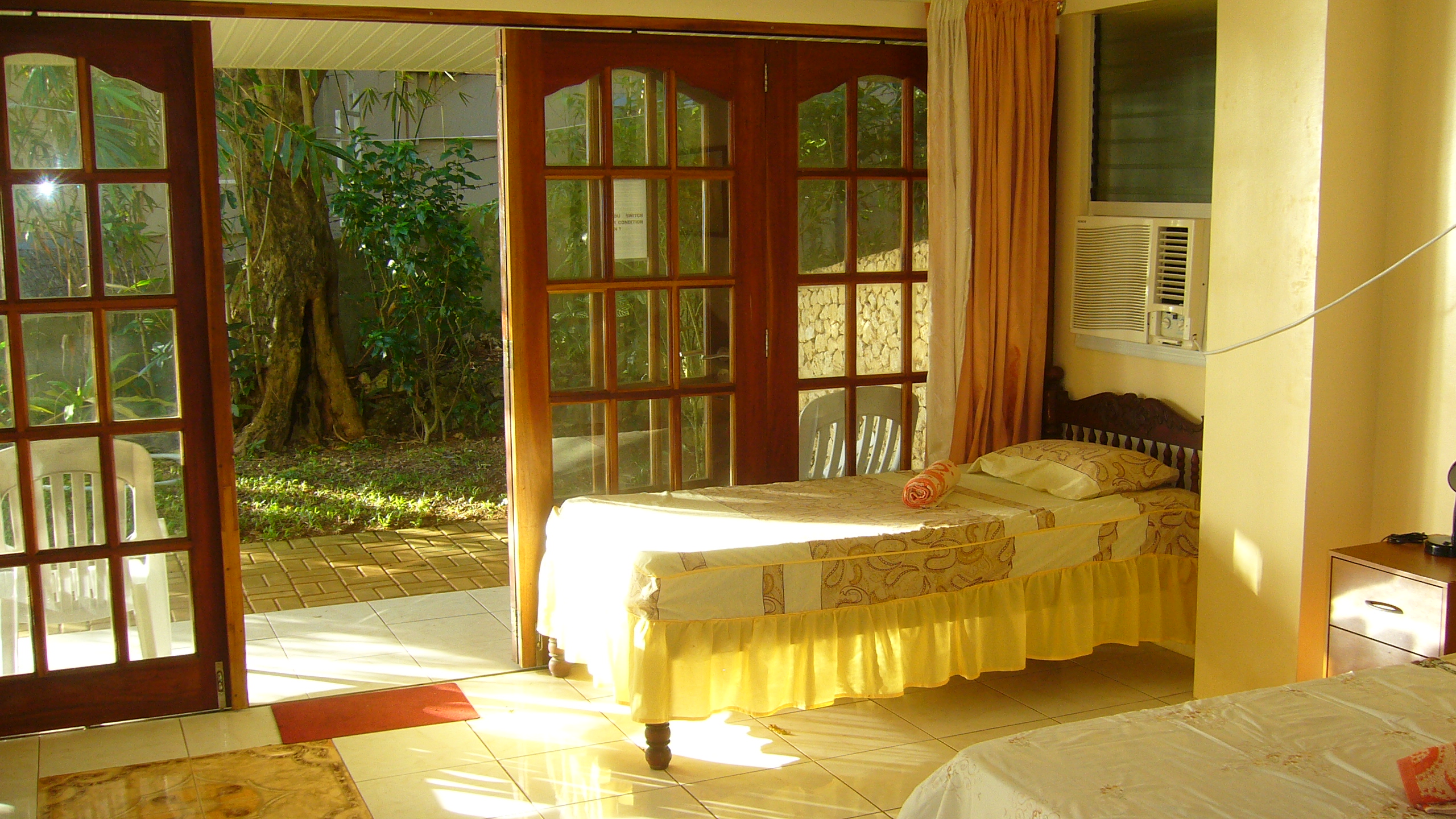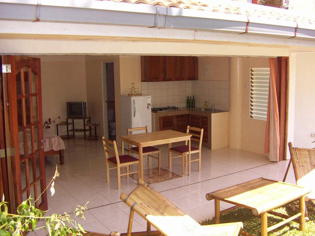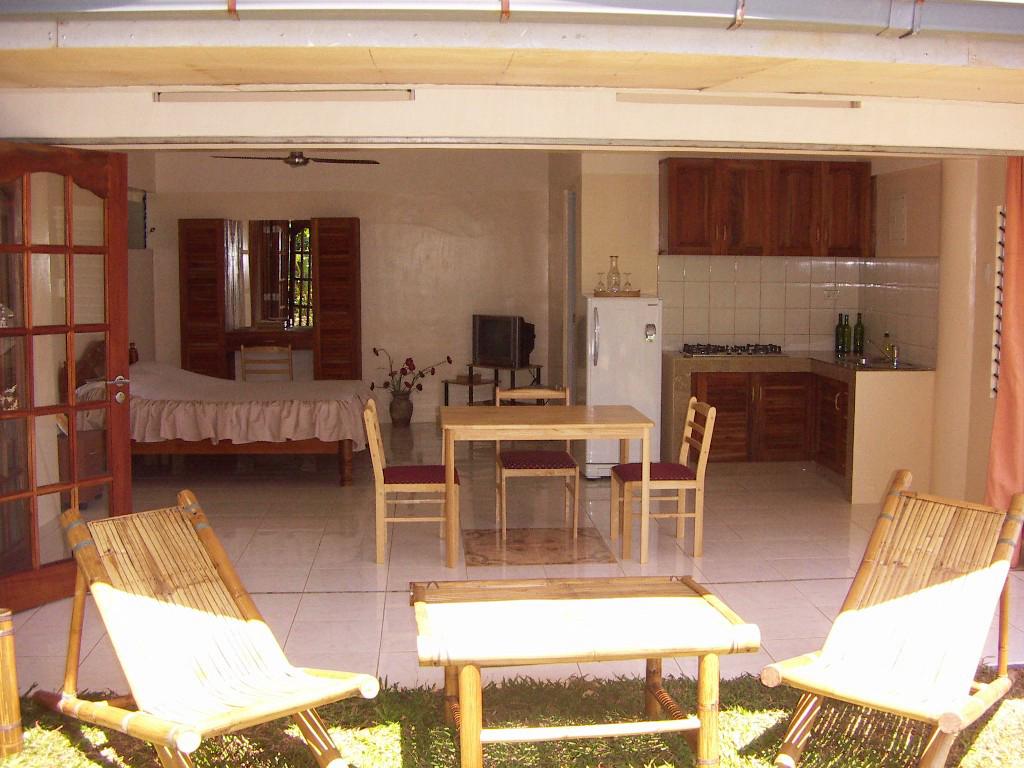 It is located on the slope above the Duplexbuilding in the main building just below the owners level. It is 6 meter wide and 5,50 meters deep to the folding doors, there is another 1,20 meters of tiled terrace under a roof overhang and another open 3 meters of lawn. The pool guest pool entrance is immediately to the left. The side windows are blurred glass so when the jalousie windows are closed no one can look into the Apartement. The glass folding door front can be covered by a curtain. Since the whole compound is surrounded by a barb-wired and alarmwired at least 2,40 meter high wall you can experience living and sleeping in the open. Year round temperature is around 28 degree Celsius. The folding doors are only needed if it´s rainy or too windy. But if you can´t be without aircondition: this apartment also offers that. | ||||||||||||||||||||||||||||||||||||||||||||||||||||||||||||||||||||||||||||||||||||||||||||||||||||||
