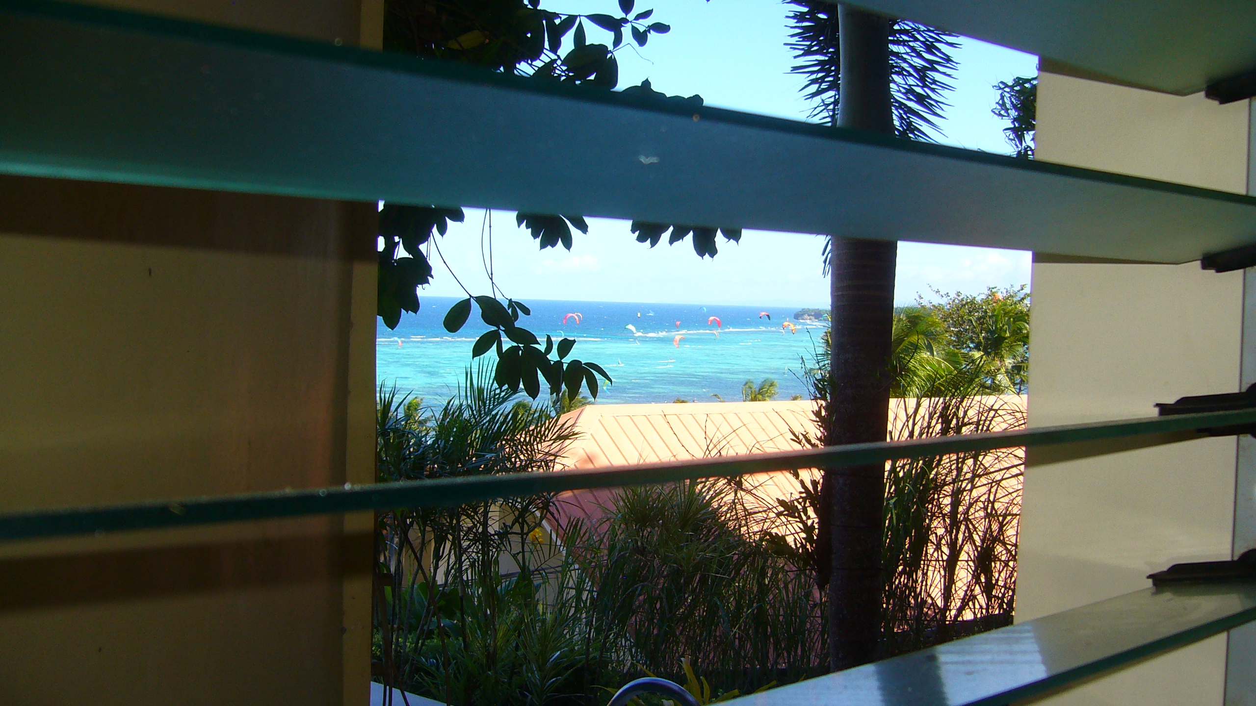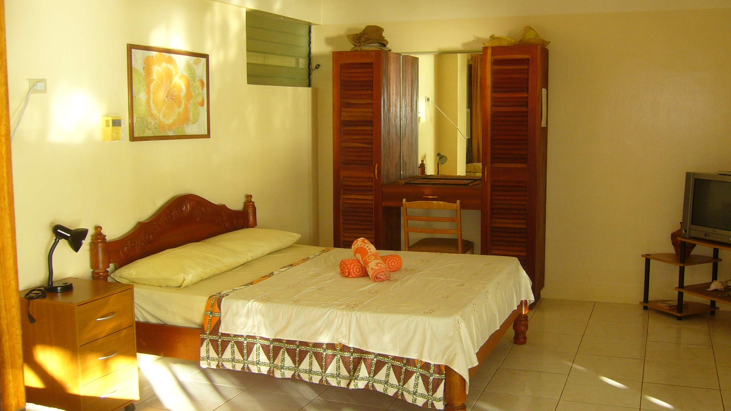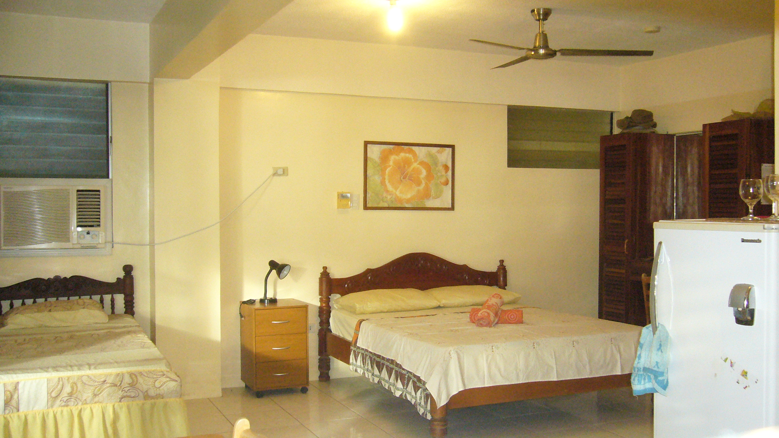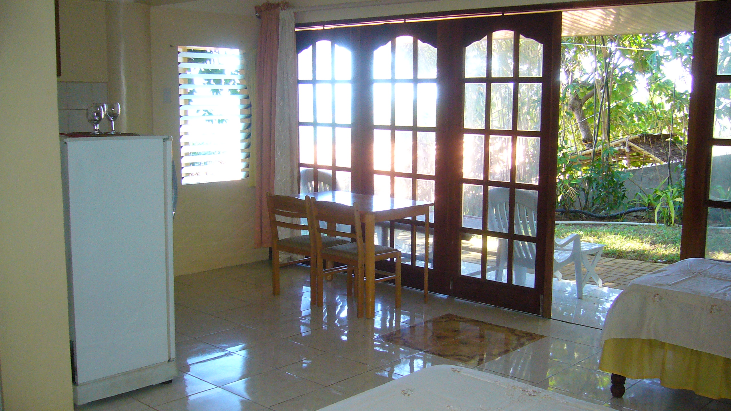 It is located on the slope above the Duplexbuilding in the main building just below the owners level. It is 6 meter wide and 5,50 meters deep to the folding doors, there is another 1,20 meters of tiled terrace under a roof overhang and another open 3 meters of lawn. The pool guest pool entrance is immediately to the left. The side windows are blurred glass so when the jalousie windows are closed no one can look into the Apartement. The glass folding door front can be covered by a curtain. Since the whole compound is surrounded by a barb-wired and alarmwired at least 2,40 meter high wall you can experience living and sleeping in the open. Year round temperature is around 28 degree Celsius. The folding doors are only needed if it´s rainy or too windy. But if you can´t be without aircondition: this apartment also offers that. | ||||||||||||||||||||||||||||||||||||||||||||||||||||||||||||||||||||||||||||||||||||||||||||||||||||||