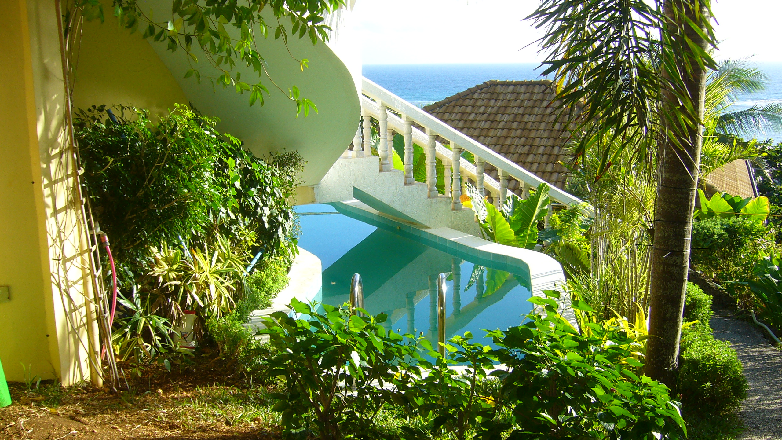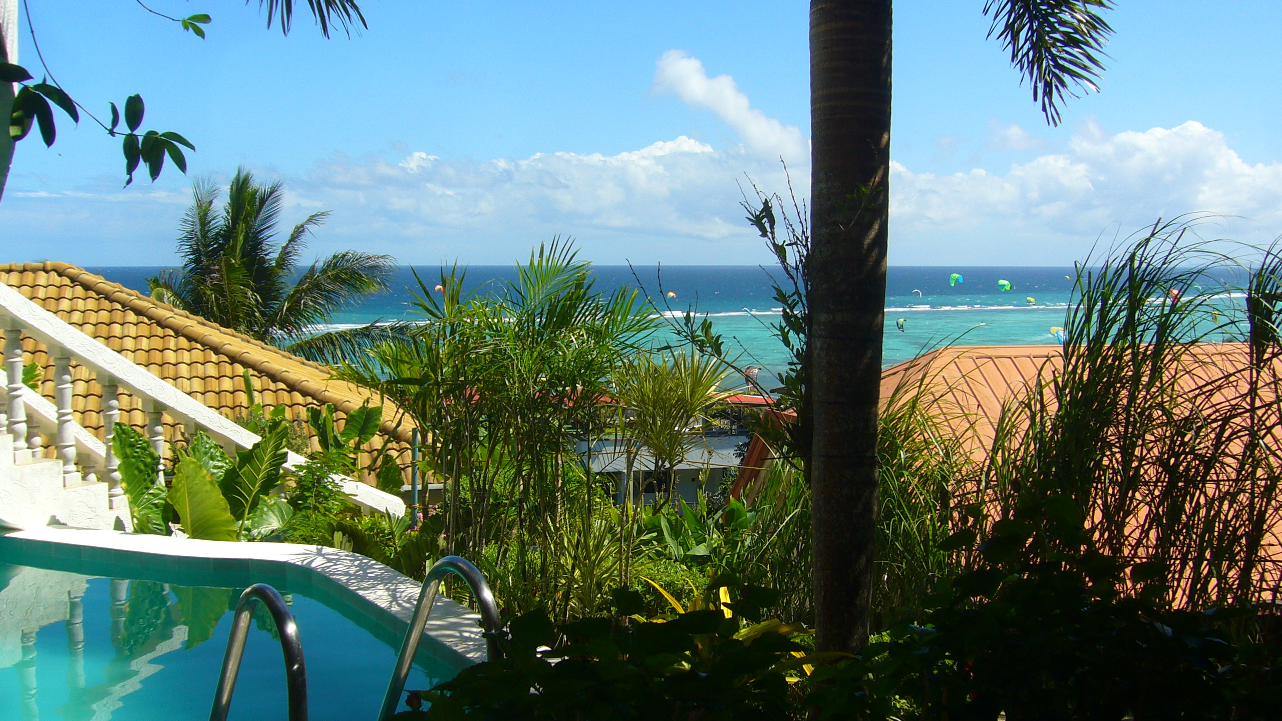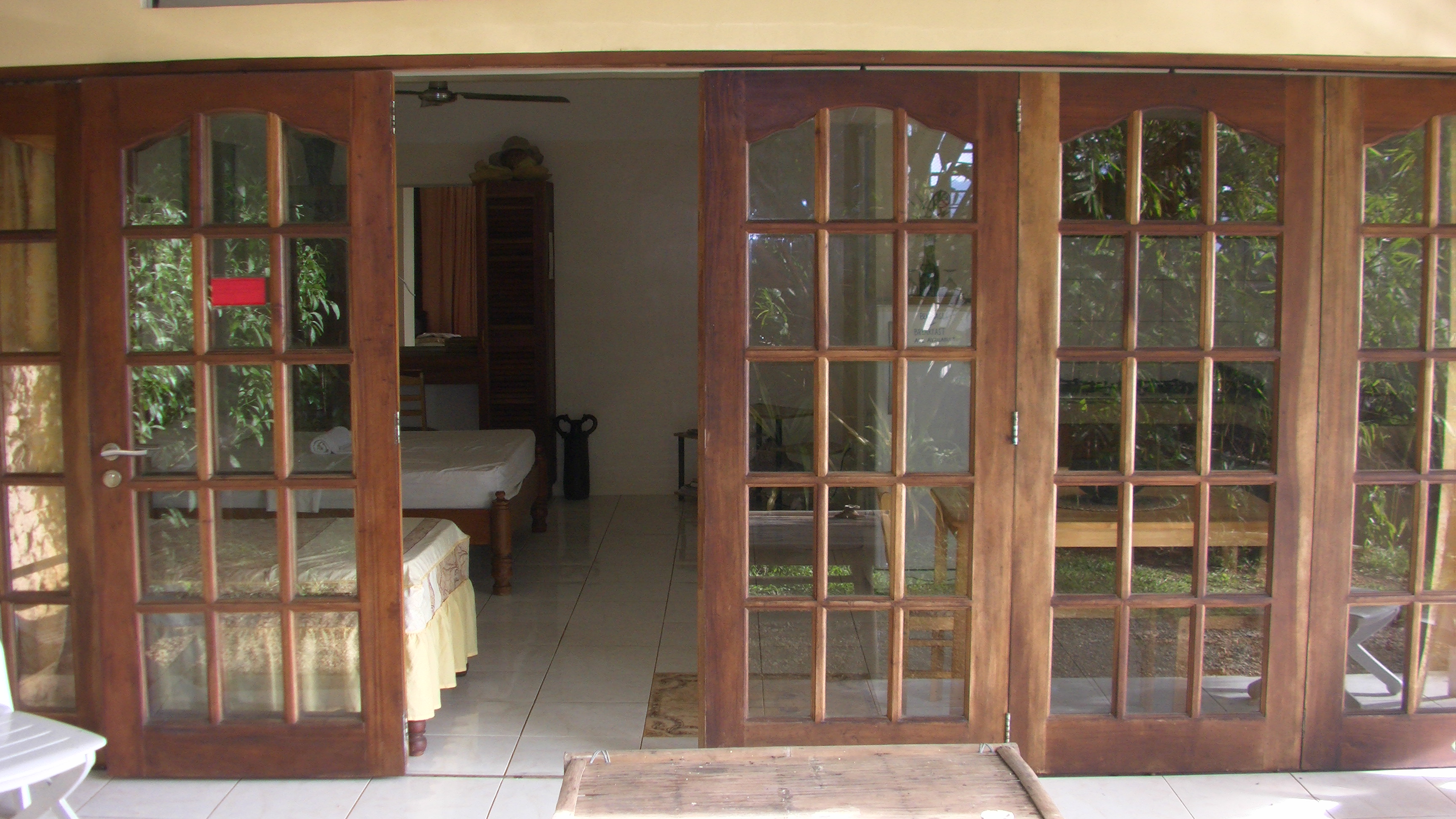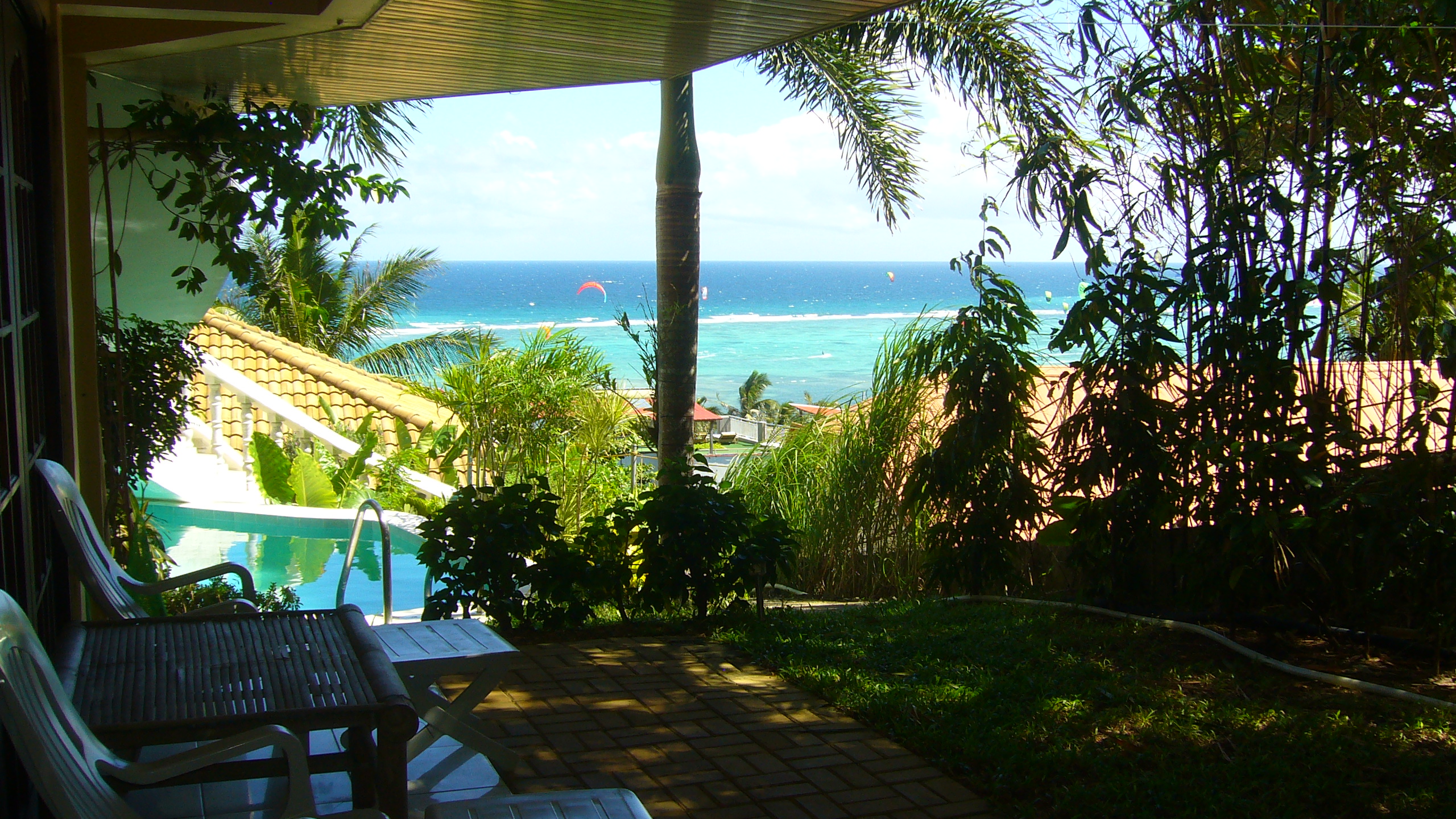 It is located on the slope above the Duplexbuilding in the main building just below the owners level. It is 6 meter wide and 5,50 meters deep to the folding doors, there is another 1,20 meters of tiled terrace under a roof overhang and another open 3 meters of lawn. The pool guest pool entrance is immediately to the left. The side windows are blurred glass so when the jalousie windows are closed no one can look into the Apartement. The glass folding door front can be covered by a curtain. Since the whole compound is surrounded by a barb-wired and alarmwired at least 2,40 meter high wall you can experience living and sleeping in the open. Year round temperature is around 28 degree Celsius. The folding doors are only needed if it´s rainy or too windy. But if you can´t be without aircondition: this apartment also offers that. | ||||||||||||||||||||||||||||||||||||||||||||||||||||||||||||||||||||||||||||||||||||||||||||||||||||||