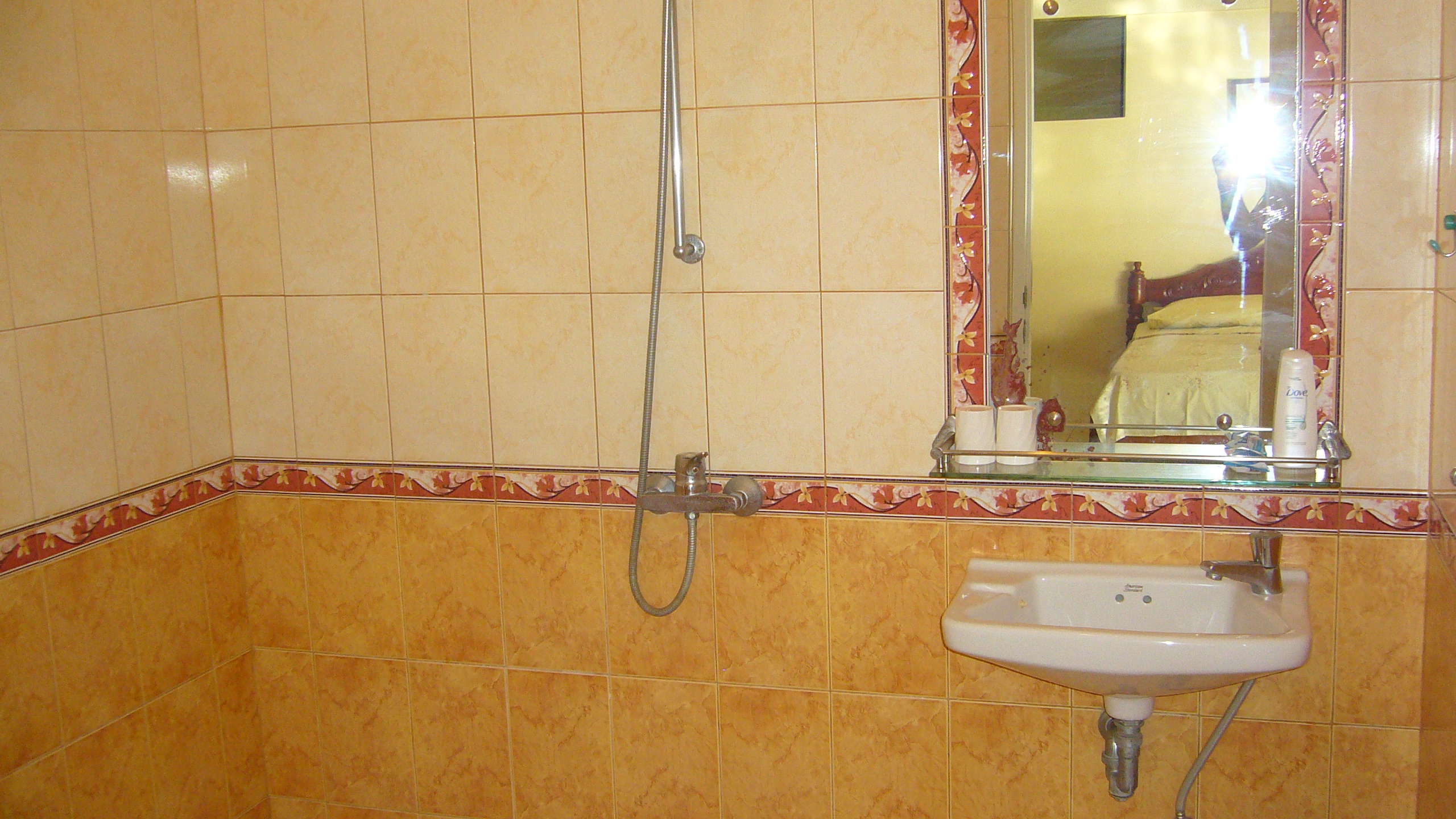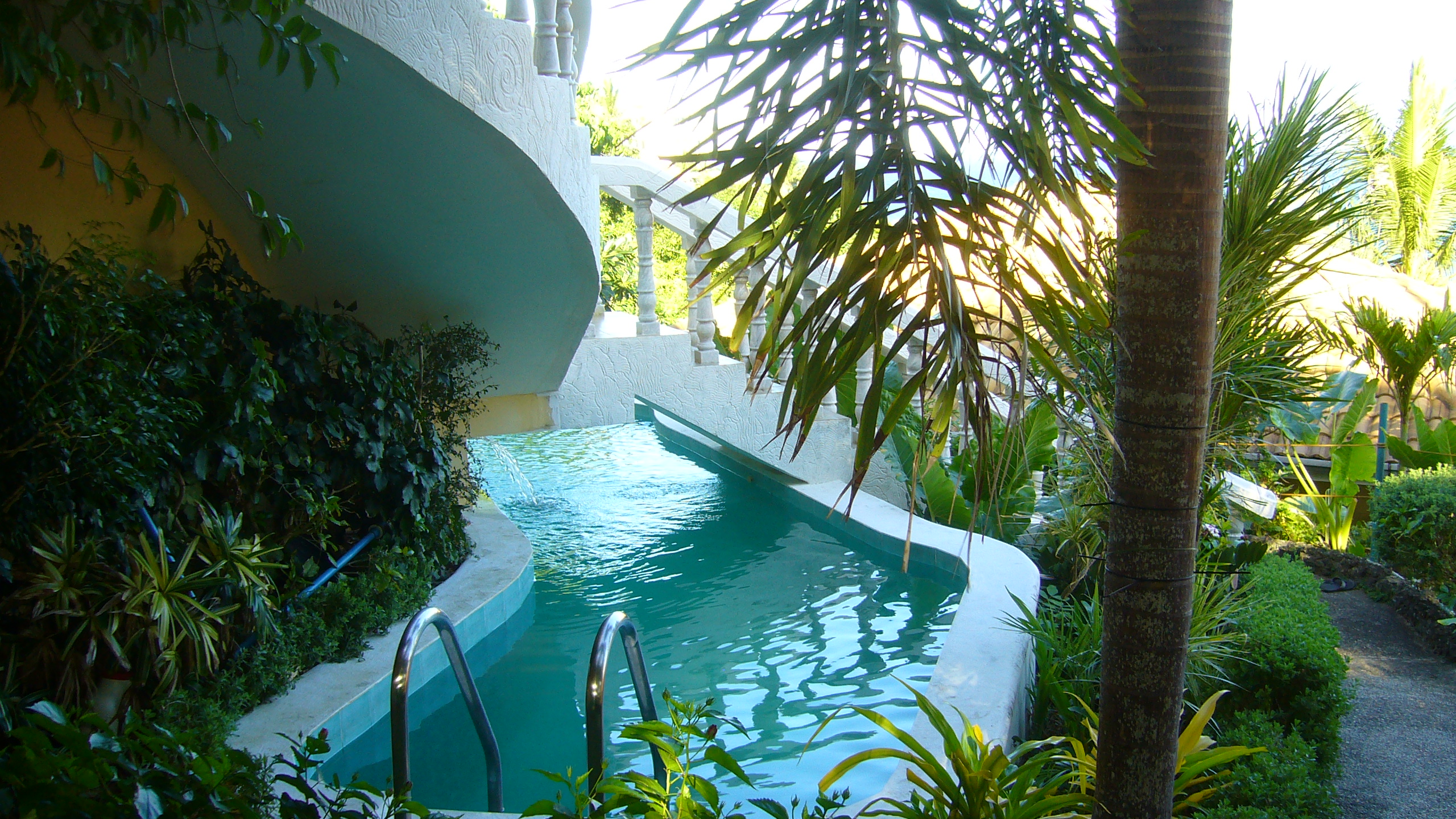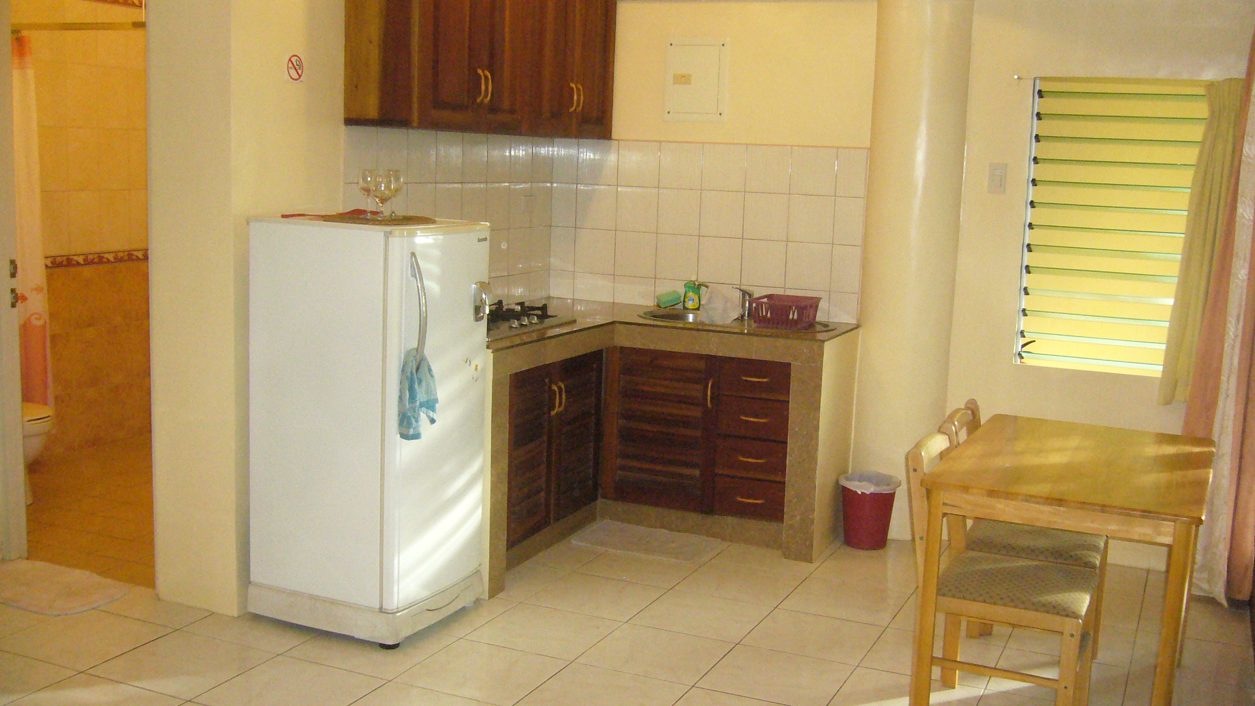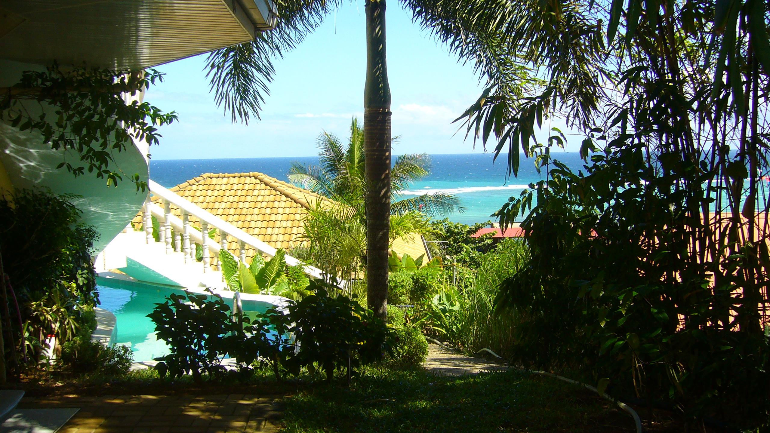 It is located on the slope above the Duplexbuilding in the main building just below the owners level. It is 6 meter wide and 5,50 meters deep to the folding doors, there is another 1,20 meters of tiled terrace under a roof overhang and another open 3 meters of lawn. The pool guest pool entrance is immediately to the left. The side windows are blurred glass so when the jalousie windows are closed no one can look into the Apartement. The glass folding door front can be covered by a curtain. Since the whole compound is surrounded by a barb-wired and alarmwired at least 2,40 meter high wall you can experience living and sleeping in the open. Year round temperature is around 28 degree Celsius. The folding doors are only needed if it´s rainy or too windy. But if you can´t be without aircondition: this apartment also offers that. | ||||||||||||||||||||||||||||||||||||||||||||||||||||||||||||||||||||||||||||||||||||||||||||||||||||||