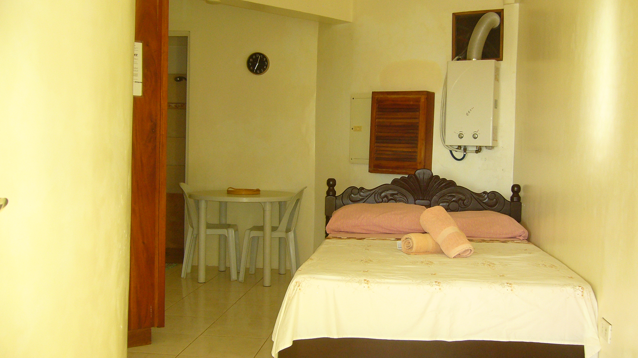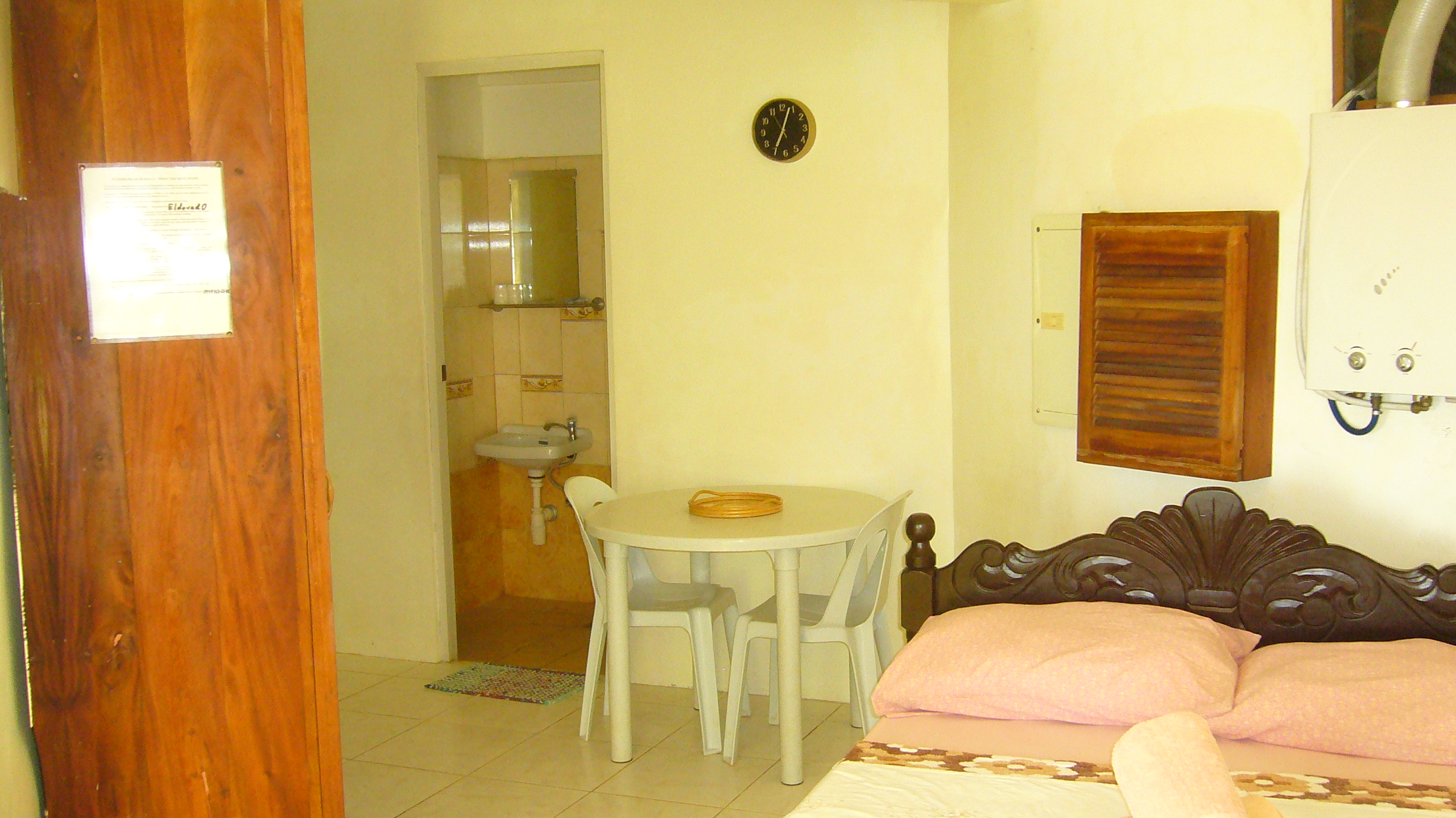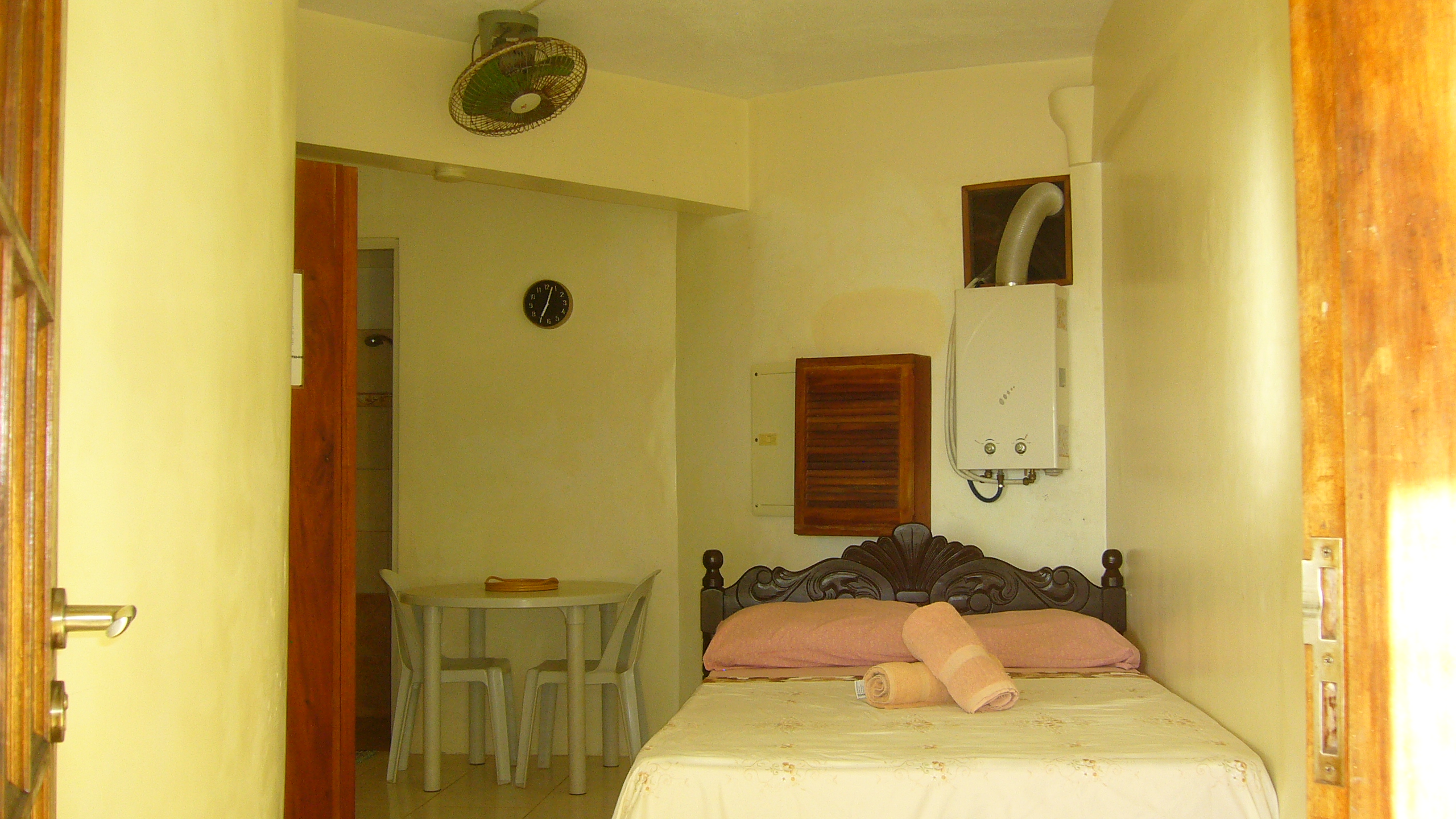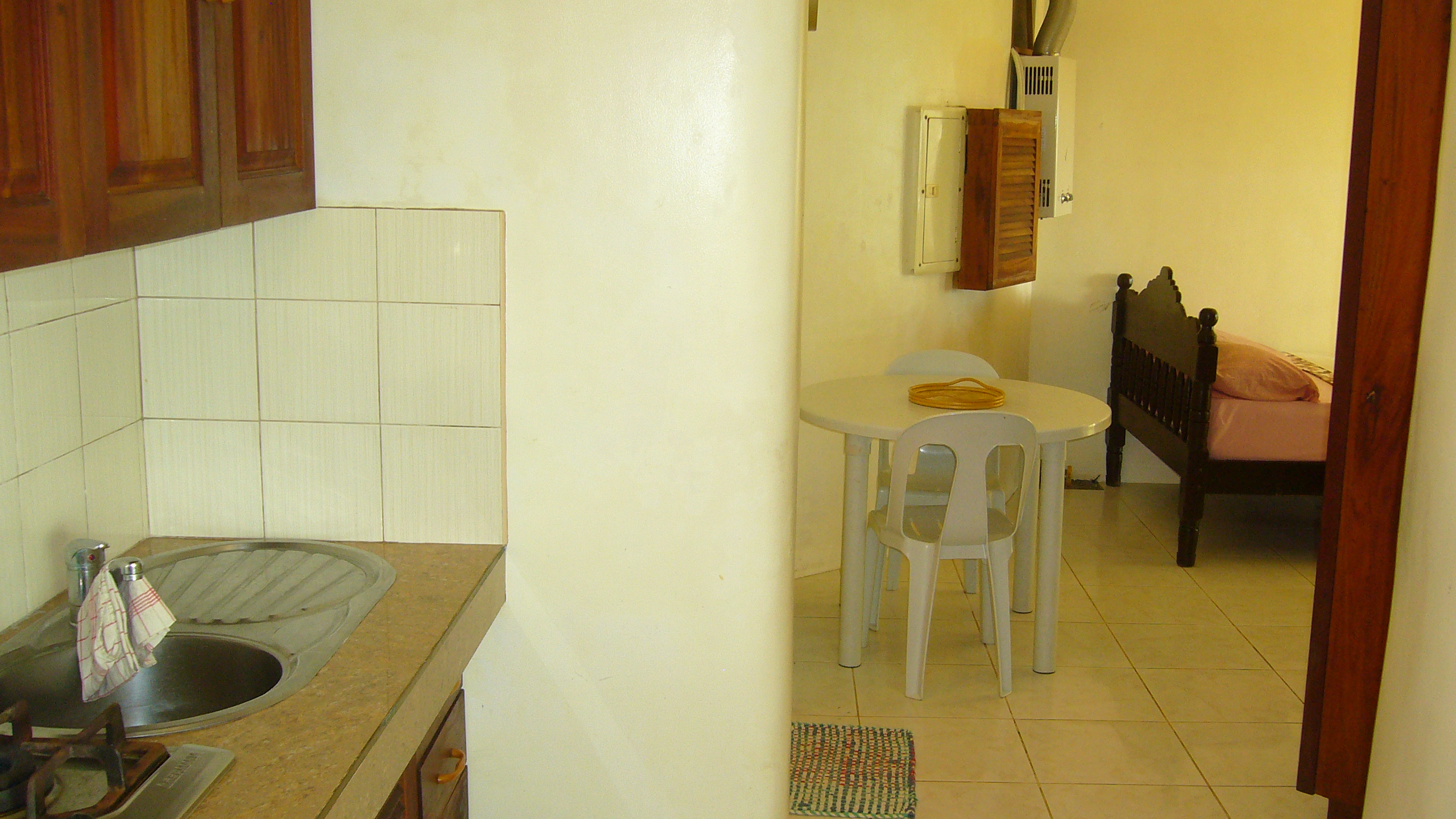 The Poolapartment is located between the First Floor South and East Apartment, consisting of the space behind the upper pool. It also has a kitchen and a small bathroom but due to its irregular shape of 21 m² only a 122 cm wide doublebed for 2 persons fits. The lower guest pool is in front of this Apartment. Both Apartment windows have oceanview. There is no Air conditioning but the airchannel that connects all Apartments of this level has an outlet on the rear of the house so the wind can go though. The central water heater is in this room and may be heard when in operation. Ideal for budget travellers who don´t want/need Aircondition but like oceanview. | ||||||||||||||||||||||||||||||||||||||||||||||||||||||||||||||||||||||||||||||||||||||||||||||||||||||